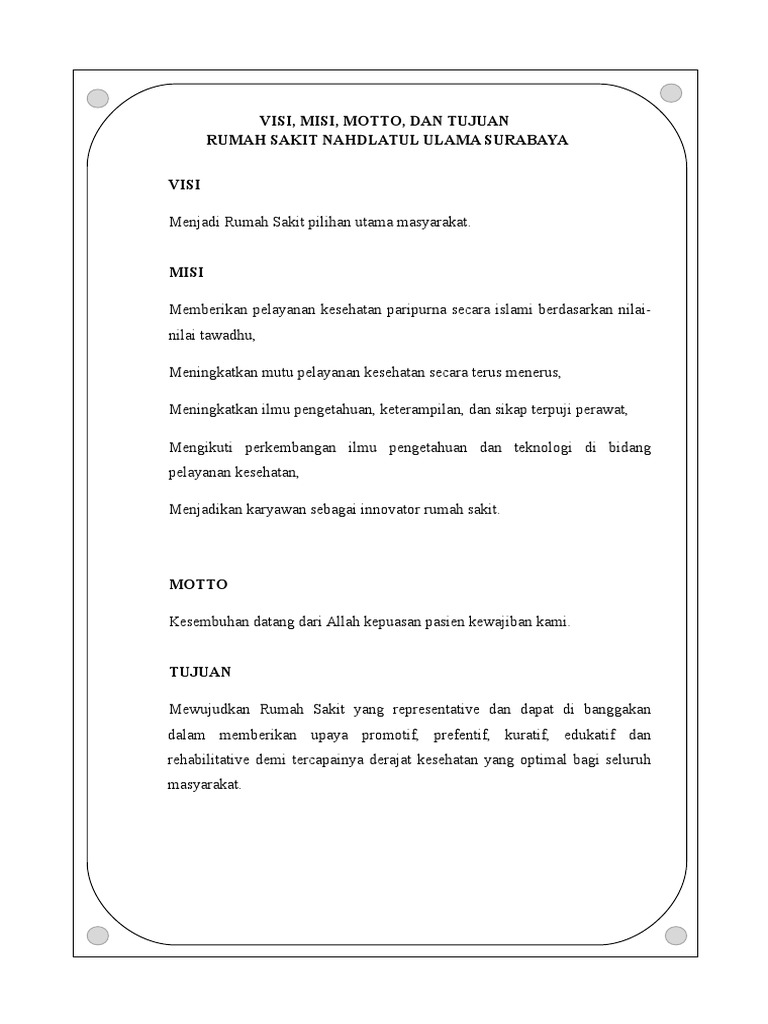 Visi Misi Motto Dan Tujuan Rumah Sakit Nahdlatul Ulama Surabaya Visi from imgv2-1-f.scribdassets.com Misi merupakan penjabaran dalam bentuk rumusan tugas, kewajiban dan rancangan tindakan yang dijadikan arahan untuk mewujudkan visi dengan berbagai indikatornya. Mengimplementasikan iman dan taqwa terhadap allah swt secara integral. Pengertian nahdhotul ulama sendiri atau yang lebih di kenal dengan sebutan nu yaitu sebuah organisasi islam terbesar di indonesia. Menciptakan lingkungan sekolah yang islami. Sebuah organisasi yang di dirikan oleh para ulama' pada tanggal 31 januari 1926 m/ 16 rojab 1344 h di surabaya. Nu durungbedug candi sehingga mampu: Ya, artikel saya kali iniakan membahas tentang visi nahdlotul ulama di bidang agama. Terwujudnya sumber daya manusia berkarakter ahlussunnah wal jamaah yang berkompeten, berkarya dan berdaya saing pada 2035.